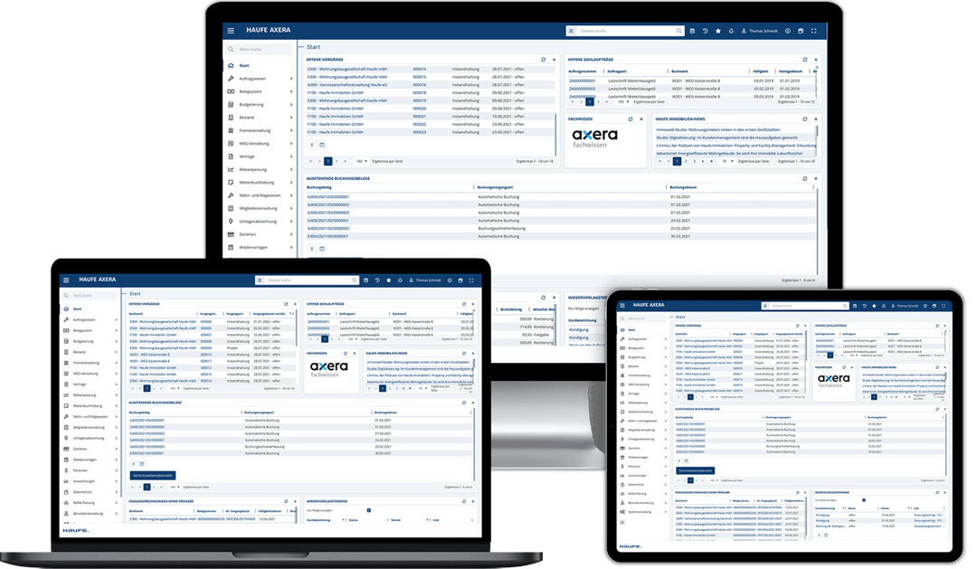 Haufe axera ist eine digitale und offene Arbeitsplattform, auf der sich alle wichtigen Vorgänge des wohnungs- und immobilienwirtschaftlichen Unternehmens zentral und sicher erledigen lassen. Verwalten und bewirt-schaften Sie in Echtzeit, damit Ihnen die Arbeit schneller, einfacher und flexibler von der Hand geht.